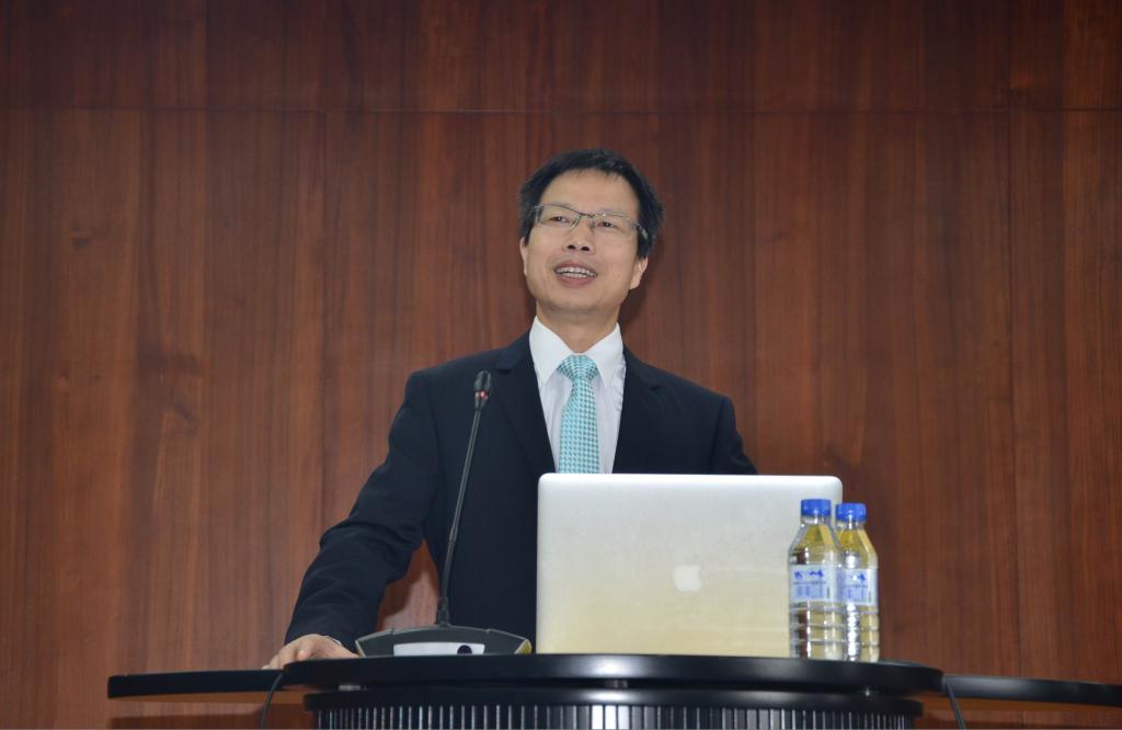图1:广东外语外贸大学新闻与传播学院副院长何国平教授在作讲座。