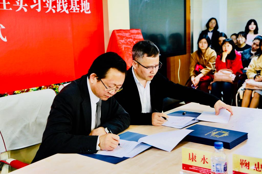 院长兼新闻与传播学院院长徐正考教授等领导出席仪式并讲话,徐正考院长与廖晓华总经理签订《大学生实习实践基地合作协议》,并共同为“大学生实习实践基地”揭牌。