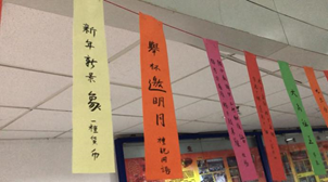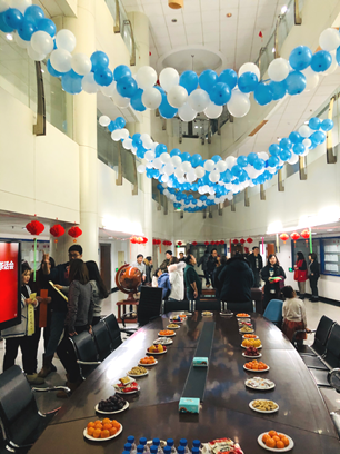 十楼四周挂着红色的灯笼,抬头向上望去,来自十一楼的气球传递着欢乐,伴随着灵动的音乐,迎新年茶话会从有趣的猜谜开始。大厅周围一条条彩色纸带上写着谜语,书法字体优美,而解谜更吸引着教职工的好奇心。