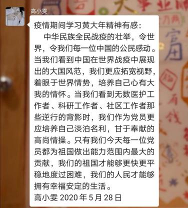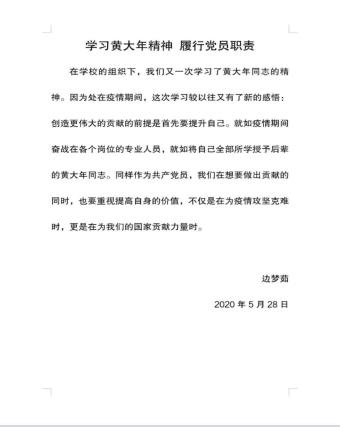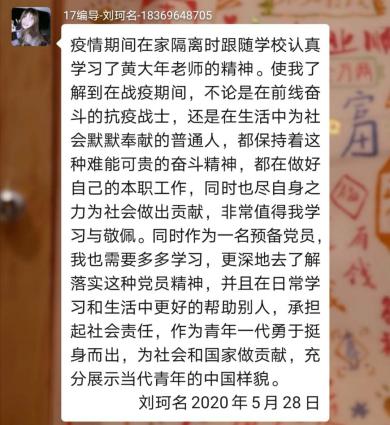 同时,此次疫情带给同学们有关人生道路的思考。在黄大年精神的指引下,党员们意识到疫情期间学习不能松懈。作为一名党员,更是应该将黄大年精神落实到生活的方方面面,努力提升自己,在尽心尽力做好自己本职事情的基础上,为国家贡献出自己最大的力量。
