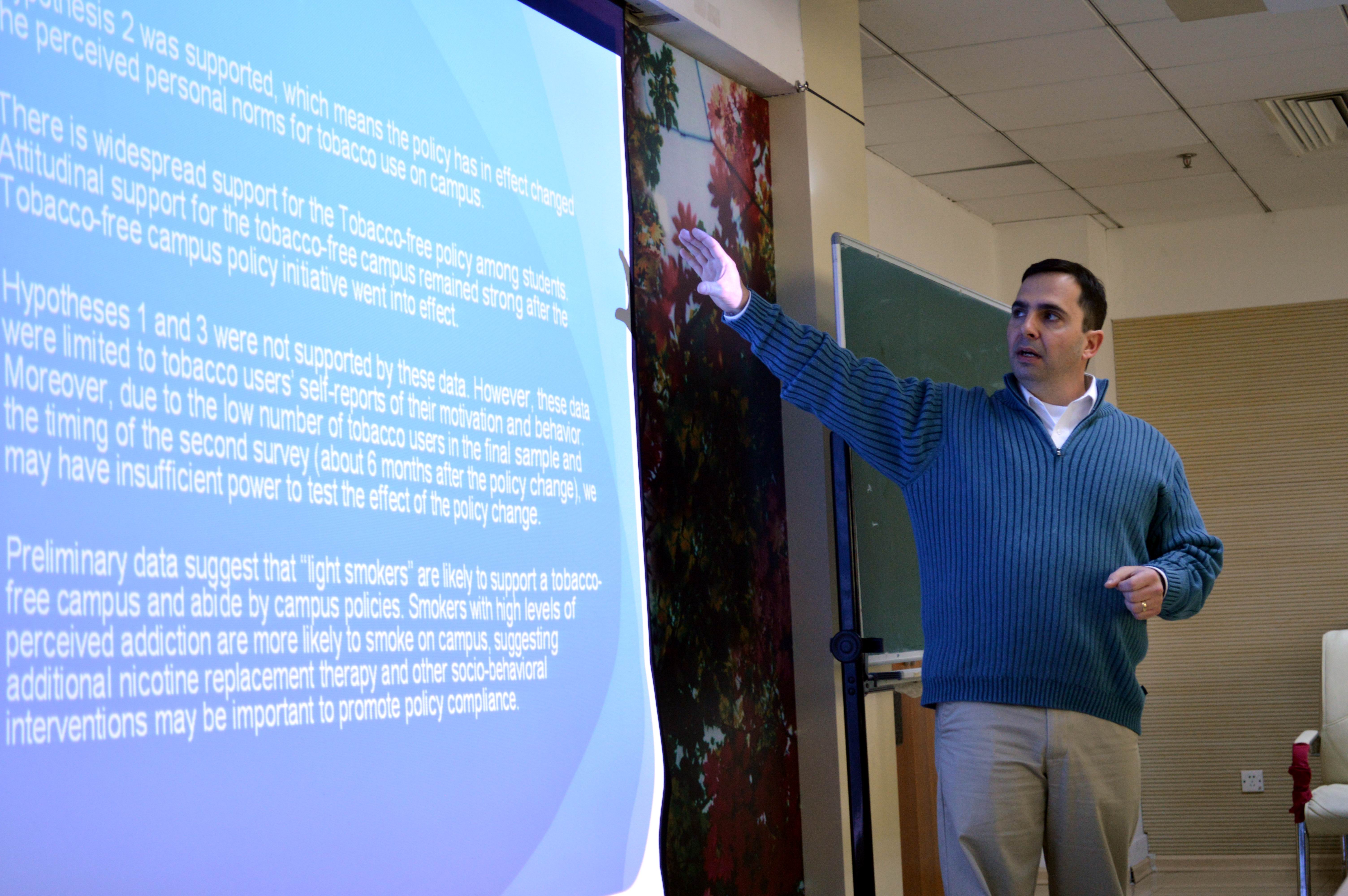 尽管赫尔姆先生乘坐的航班从美国起飞时就晚点8个多小时,但他不顾长途旅行的劳顿,仍按原计划于12月8日上午为学院师生作了题为《美国大学生的烟草控制、预防与戒烟》的讲座。讲座结合他的相关研究项目,围绕大学生对烟草使用的态度、规范和政策等方面展开,详细介绍了当前美国烟草的使用情况和影响、大学生吸二手烟等相关研究,以及针对实行无烟政策大学生的普遍态度和大学生中男性吸烟的原因、对健康的影响等问题。赫尔姆先生还从历史与现实两方面探讨了有关美国大学生在烟草使用方面的趋势,探究了烟草使用包括日常的与非日常的吸烟、抽水烟、无烟烟草(包括浸泡烟草、咀嚼烟草),还特别探讨了在大学校园日渐流行的新趋势——电子香烟的使用。