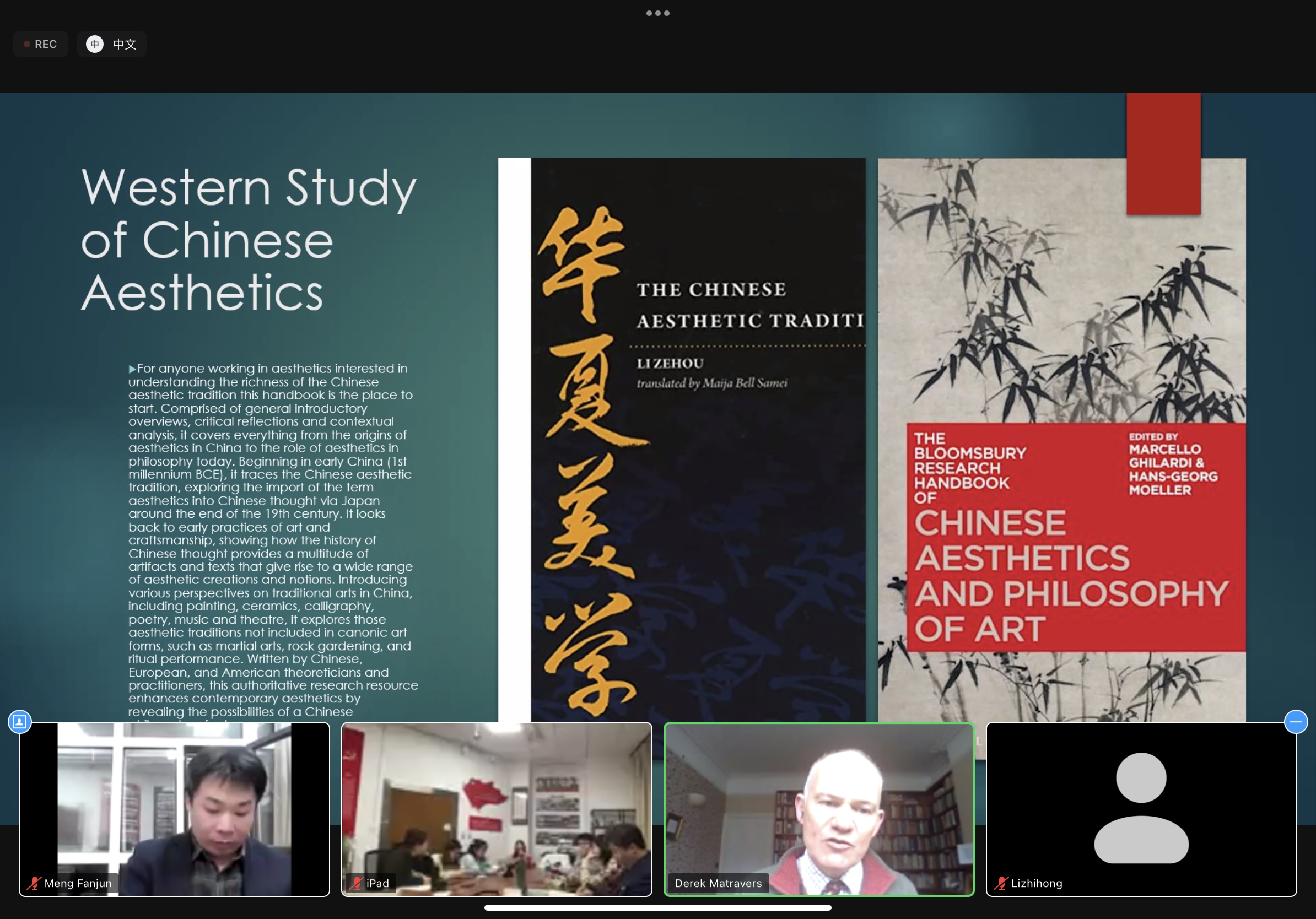 副院长梁玉水教授致欢迎辞。李志宏教授、姜勇教授、张羽副教授参加讲座并与Derek教授进行了交流。学院硕士博士研究生共计三十余人聆听了讲座,其中2022级文艺学专业组织了集体学习,讲座还邀请了部分浙江大学博士研究生参加。认知美学与美育研究中心副主任孟凡君副教授主持了本次讲座。