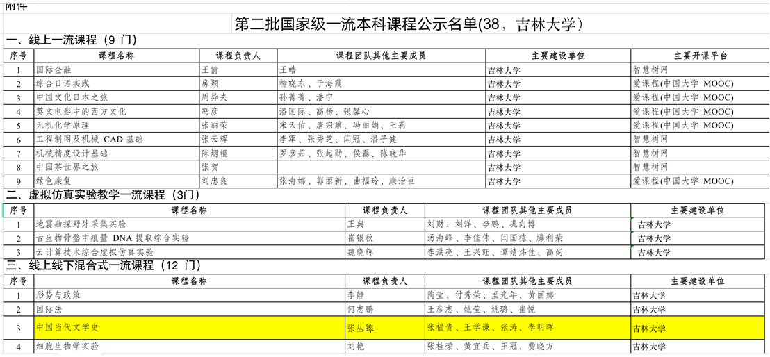 张丛皞教授作为课程负责人主持建设,张福贵、王学谦、张涛、李明晖四位老师作为主要参与人共同参与运营的《中国当代文学史》课程成功入选国家级线上线下混合式一流课程。