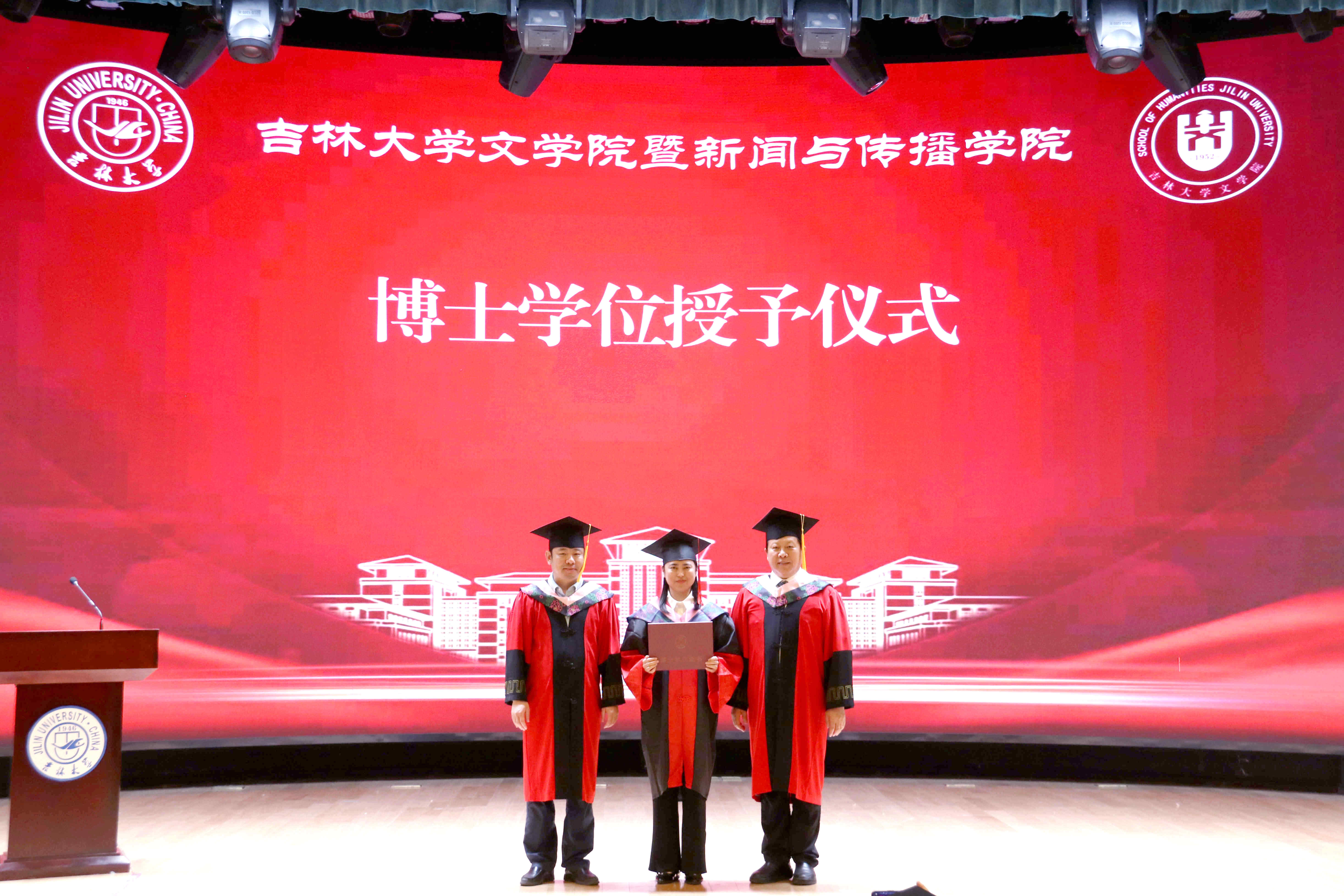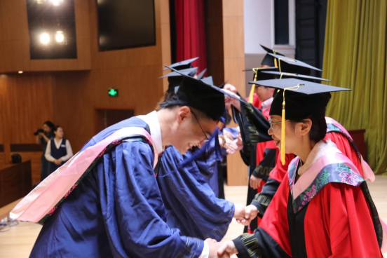 哲学社会科学资深教授张福贵、院长张丛皞为获得博士学位的同学一一授予了学位。随后,七位主礼教授移步台上共同为获得硕士学位的学生授予学位。