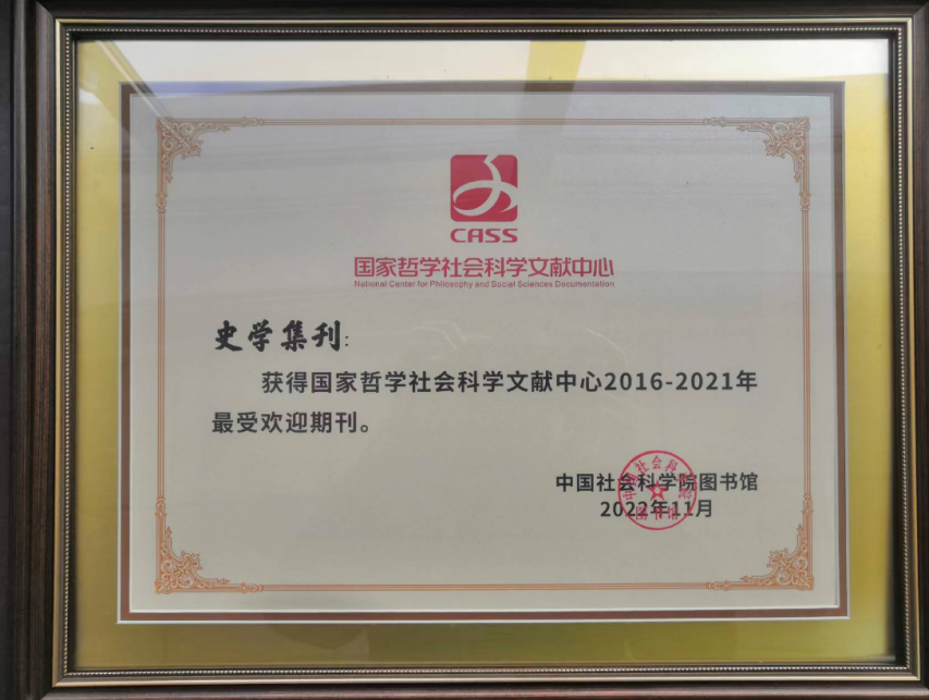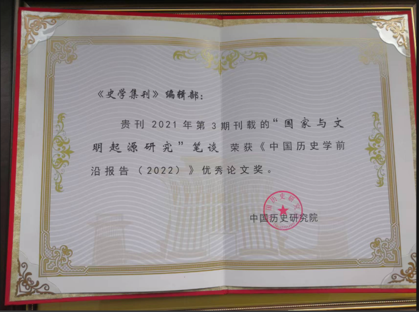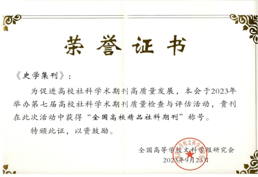 《史学集刊》荣获郭沫若中国历史学奖“优秀史学刊物奖·优秀奖”。