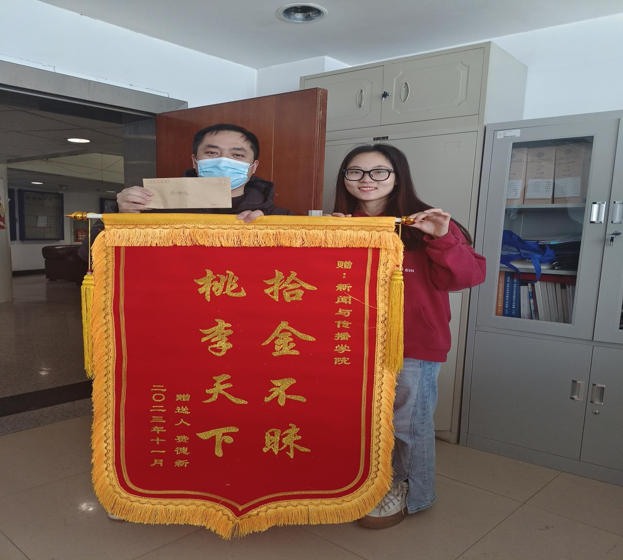 暨新闻与传播学院学生工作办公室门口,他手中拿着一面锦旗、一封感谢信,来院对学生本人及学院的培养表达感谢。辅导员杨佳欣老师立即停下手中的工作前来接待。在交谈中了解到,失主费医生于11月25日和朋友在我校附近小聚,畅谈到下午四点多。由于晚高峰打车困难,费医生步行了一段路才乘出租车回到诊所。到诊所后才发现自己的钱包不见了。不记得车牌号的失主费先生惊慌失措,正值心灰意冷的时刻,黄色韩漫