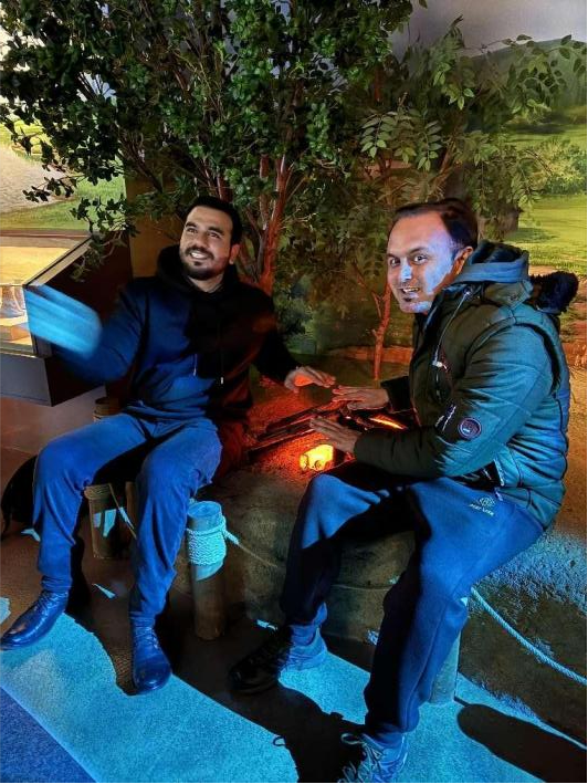 两位巴基斯坦同学饶有兴致地体验东北史前聚居文化
