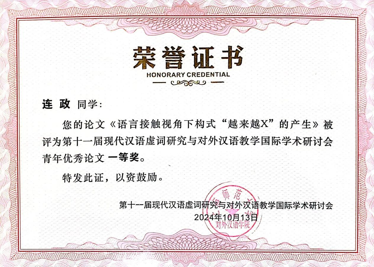 23级语言学及应用语言学硕士研究生连政的论文《语言接触视角下构式“越来越X”的产生》荣获“青年优秀论文一等奖”。