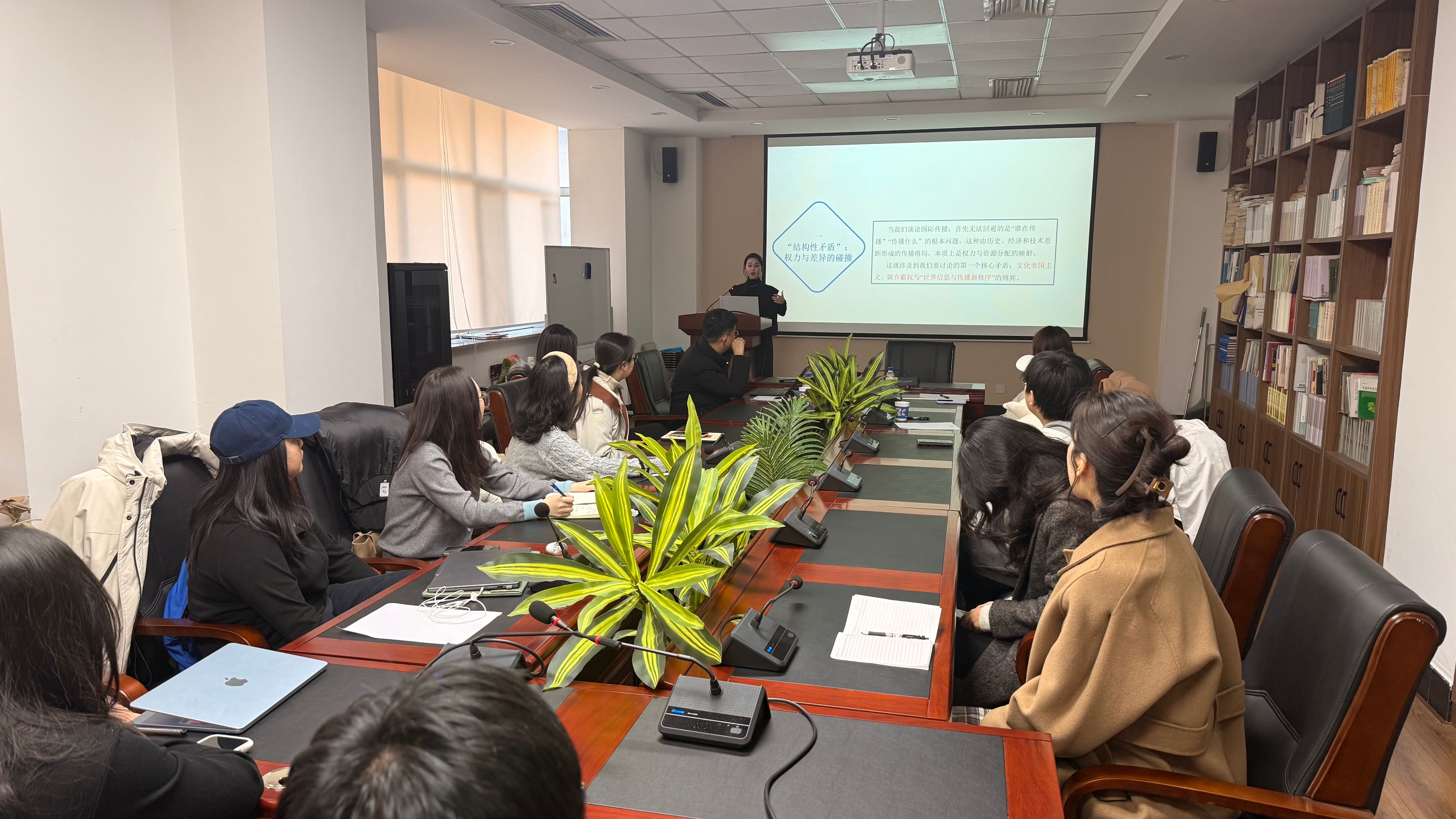 张斯琦教授以“马克思主义新闻观引领下的新媒体国际传播创新路径研究”为题作出学术报告。报告中,张斯琦老师从马克思主义新闻观角度出发,以“构建中国特色战略传播体系”为纲,探讨了通过构建多元传播体系、加强区域国别研究、推动文化产品出海等路径,提升中国国际传播效能、讲好中国故事的实践策略。
