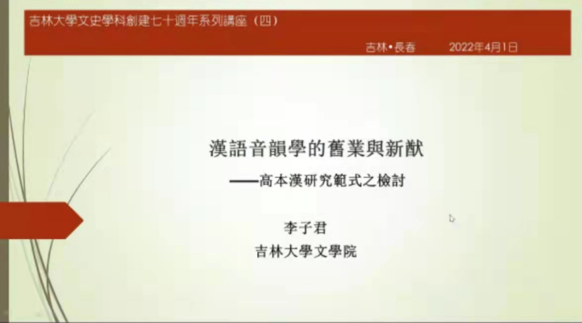 暨新闻与传播学院主办的文传文史学科70周年系列讲座之《音韵学之旧业与新猷》于2022年4月1日18时30分以线上会议的形式准时举行。200余名吉大师生准时进入腾讯会议会议室聆听讲座。