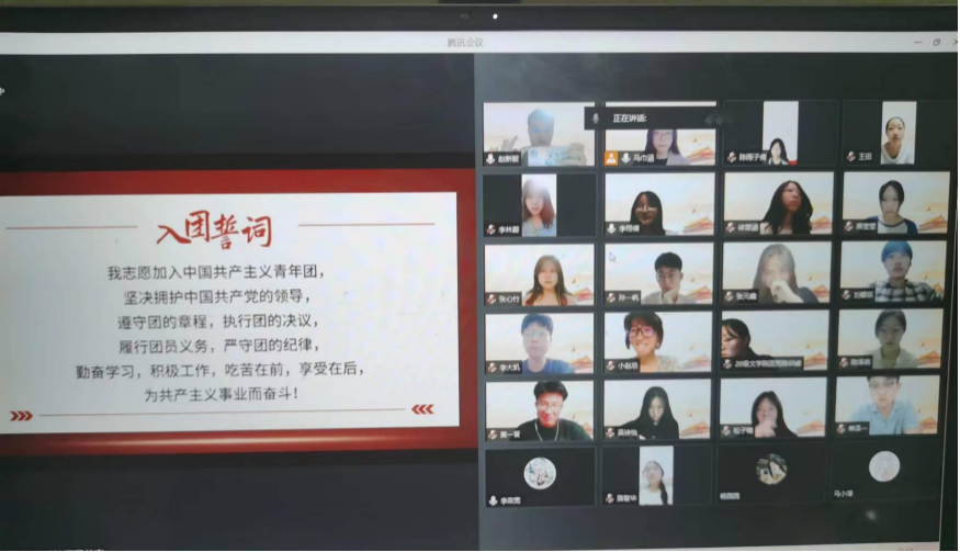汉语言文学专业2020级团支部于5月19日晚9时举办了“不负青春韶华,勇担复兴重任”线上主题团日活动,全体团员共同参与。首先,同学们在团支书冯千芮的带领下观看并学习习近平总书记在中国人民大学考察时的重要讲话及总书记对青年的寄语,中国共青团始终与党同心、跟党奋斗,团结带领广大团员青年把忠诚书写在党和人民事业中,时代各有不同,但青春一脉相承。广大团员青年们应把青春播撒在民族复兴的征程上,把光荣镌刻在历史行进的史册里。随后由团支书张艺馨同学领誓,2020级汉语言文学专业的全体团员共同重温入团誓词,以此坚定团员们理想信念,激发团员们民族自豪感、使命感和责任感。