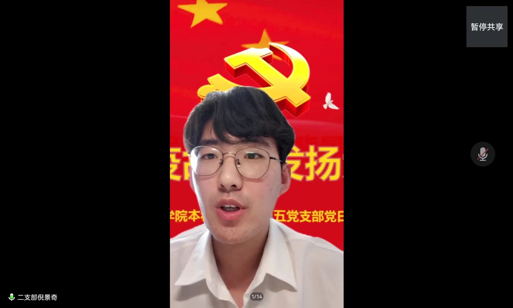 活动第三项,为纪念习近平总书记对黄大年同志先进事迹重要指示精神五周年,让黄大年精神在抗疫育人中发扬光大,第二、第五党支部进行集体线上专题学习。由第五党支部书记王振彰领学,带领大家集体学习贯彻习近平总书记对黄大年同志先进事迹重要指示精神,学习黄大年老师的生平事迹。黄大年老师年是一名吃苦耐劳,胸怀大志的地探队员,立志为祖国地探事业做出贡献刻苦努力的学习,掌握世界最前沿技术,也在祖国最需要的时候,毅然决然的回到了祖国和母校的怀抱,黄大年老师有句非常令人动容的话:“我没有朋友,没有敌人,只有国家利益!”他的心中从来都没有小我,他的心中,容纳的是国家,是中华民族伟大复兴的历史使命。他并不是孤身一人地为信仰而奋斗,而是在与无数伟大先贤并肩成为国家与民族崛起的脊梁。在人生道路上,他始终怀揣梦想,脚踏实地、创新务实、甘于奉献。他用自己的一生回报养育他的祖国,用自己的才华和智慧奉献他深爱的祖国,更用自身有限的生命为国家培养出一批批“大年式”的浪花们,呼啸地加入民族复兴的滚滚洪流之中!我们每个人都在被大年老师精神不断激励着。新时代下,我们每一位莘莘学子身上所肩负的不仅仅是个人价值的实现,更是中国梦想国家富强的实现,在我们的身边有和我们一样奔涌着的浪花,在推动着社会向前发展,当15亿的朵朵浪花汇聚成一股强大的激流,定会在世界掀起雄伟瞩目的澎湃浪潮!我们要一步一个脚印,奋力拼搏,为我们的理想坚定地走下去,不留遗憾,像黄大年老师一样,用我们的生命拥抱伟大的中国梦想。