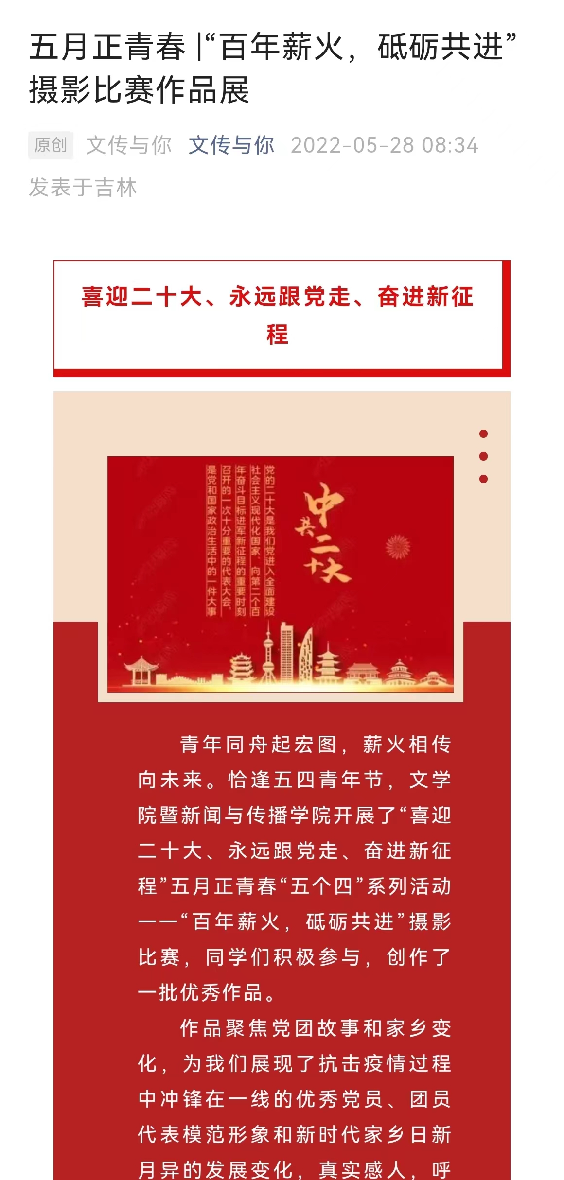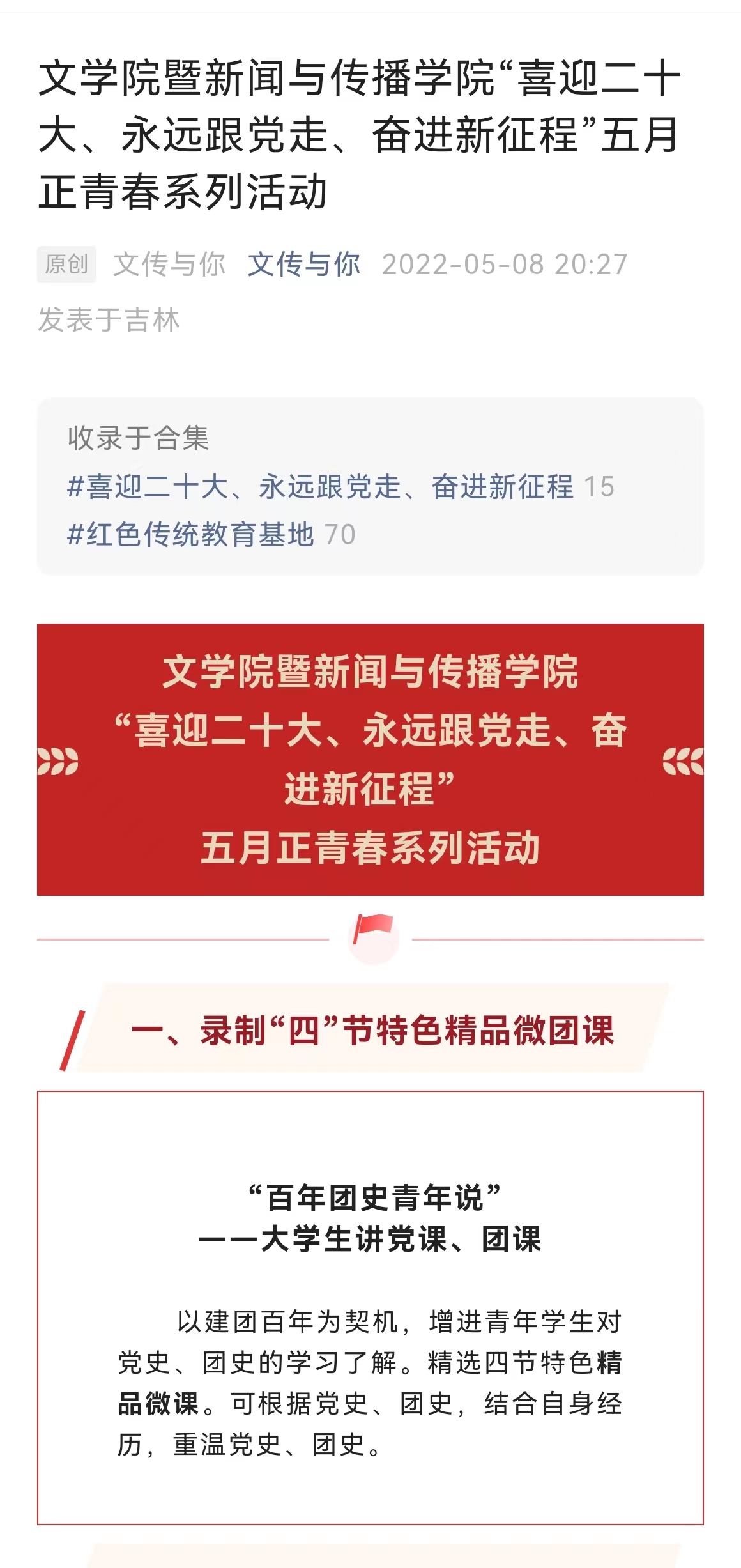 暨新闻与传播学院开展“喜迎十二大,永远跟党走,奋进正青春”五月正青春,五个“四”系列活动,活动得到学院师生的积极响应。