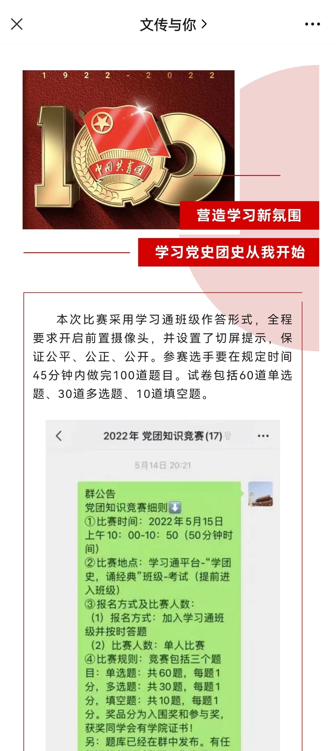 公众号等渠道了解活动、积极投稿,经学院评定,最终来自新闻与传播学类2021级团支部的石如玉获得特等奖,来自新闻与传播学类2020级团支部的焦若彤、刘颖琪、朱富鑫获得优秀奖,来自汉语言文学2021级团支部的王鹏茹获得优秀奖。本次活动加深了同学们对百年团史的学习了解,增强了广大学生的爱党爱团意识。