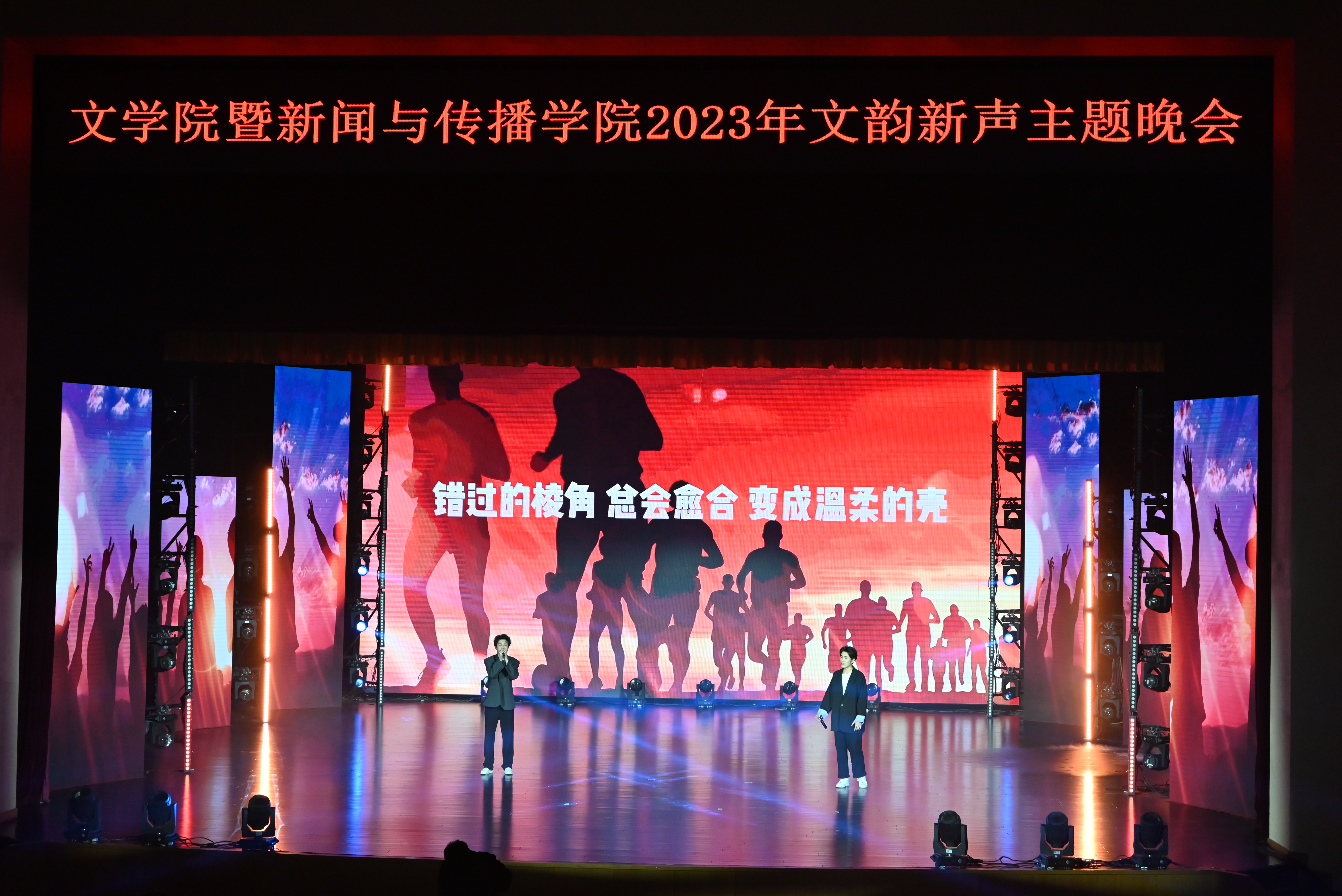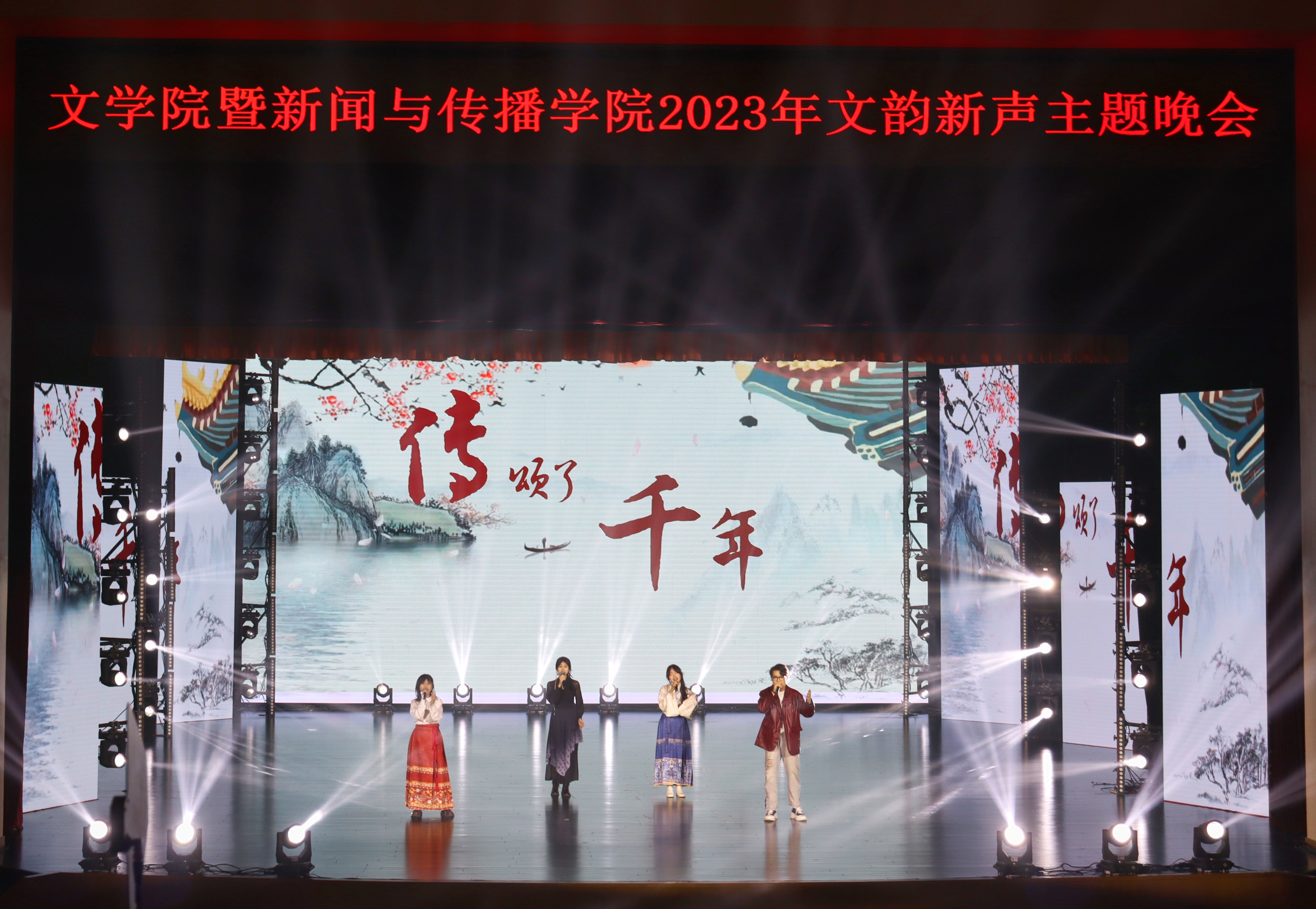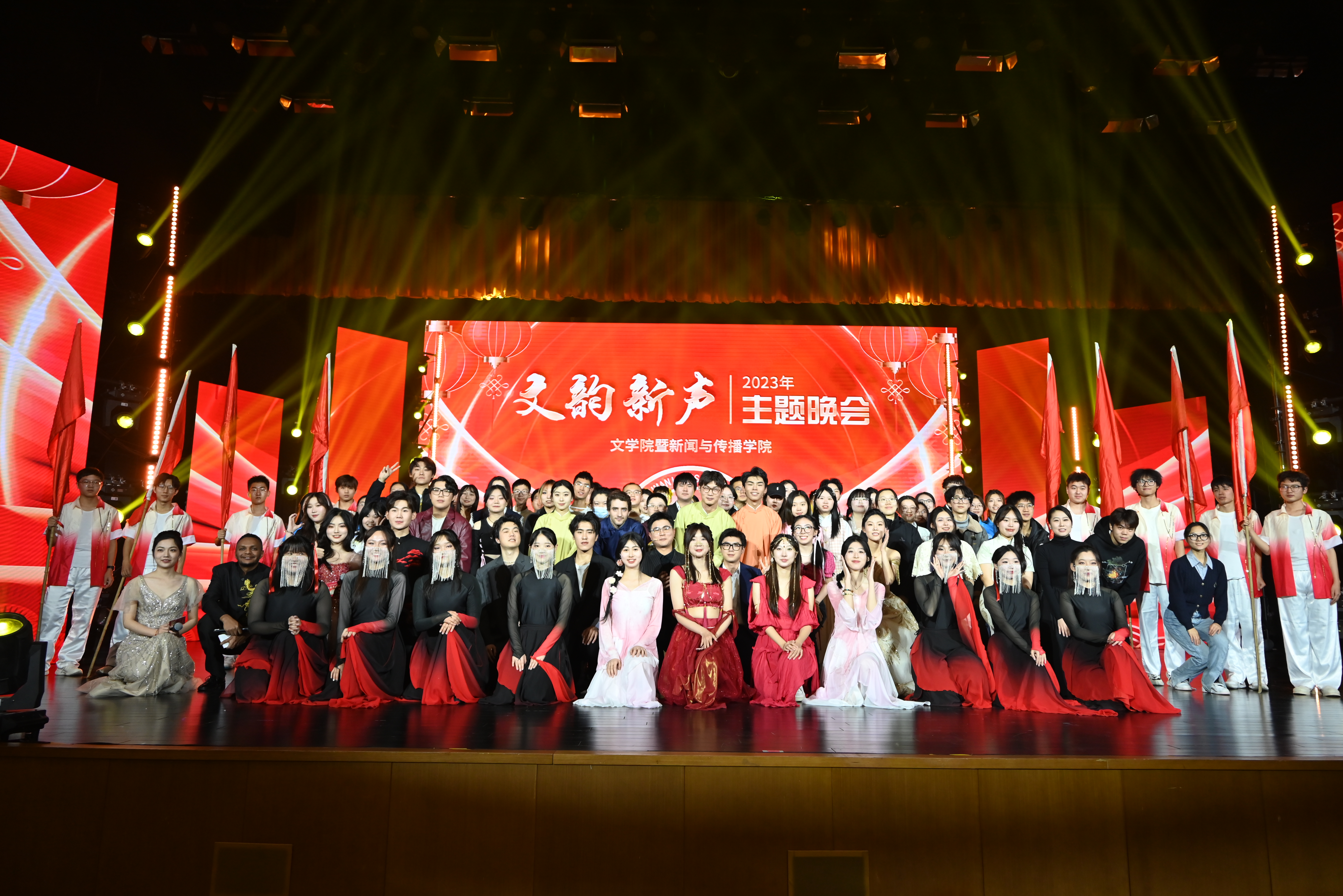 最后,伴随着振奋人心的校歌与现场师生热烈的掌声,晚会圆满落幕。本场晚会从节目策划、舞台设计、视频拍摄到排演的一帧一幕,均由学院师生团队独力完成。这既是一场丰富的校园文化活动,更是一次专业实习实践的的闪亮舞台!未来,文传学子将更加踔厉奋进,继续传递属于我们的“文韵新声”!