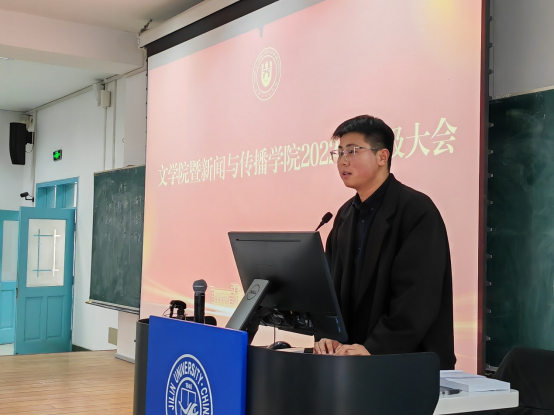 暨新闻与传播学院2022级全体同学在辅导员老师王振彰的主持下,于第三教学楼第四阶梯教室召开新学期首次年级大会。