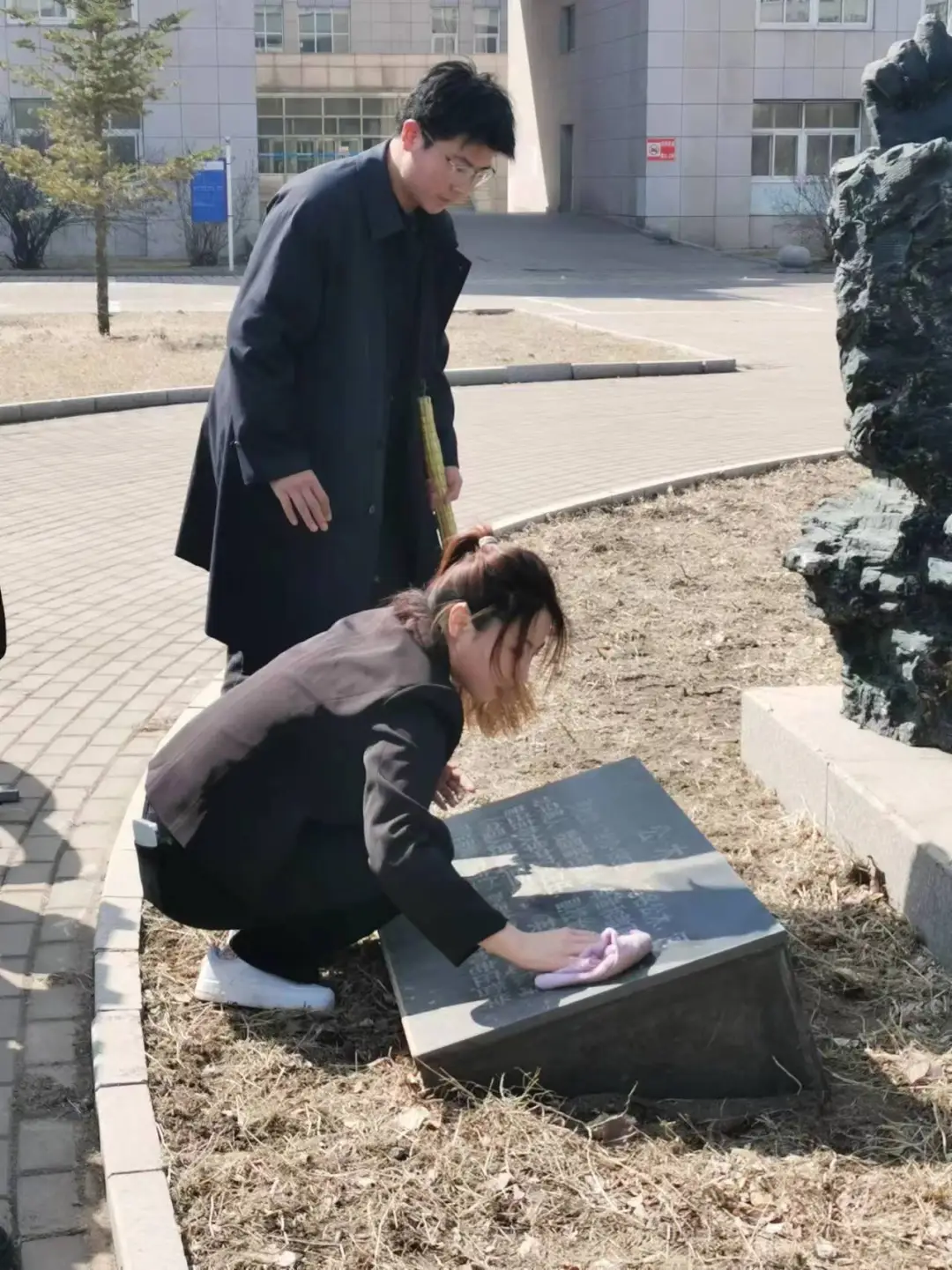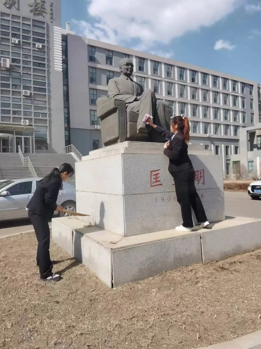 第二项活动是清扫先贤雕像,同学们庄重地走近雕像,清扫擦拭雕像上的灰尘,严肃而认真。