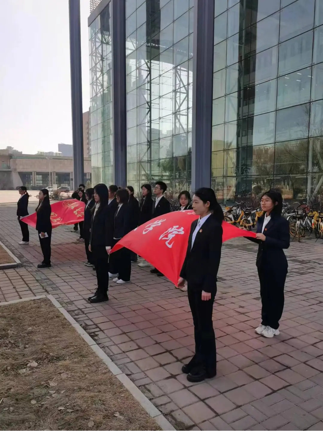 上午9时30分,同学们集合在先贤雕像前,在学院团委负责人、辅导员王振彰和活动负责人赵子璇的带领下排排站定,每位同学都身着黑色正装,胸前佩戴团员徽章肃穆而立,等待着活动的开始。