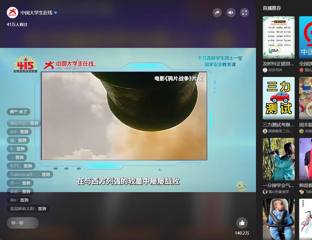 暨新闻与传播学院学生国家安全意识,培养学生的社会责任感和使命感,学院2023级全体同学观看学习了“千万高校学生同上一堂国家安全教育课”主题公开课,并在课后参加了“全国大学生国家安全知识答题”活动。本次学习由学院2023级辅导员于航老师组织,采取线上学习的形式,学习内容主要包括总体国家安全观、金融安全、军事安全三个部分。