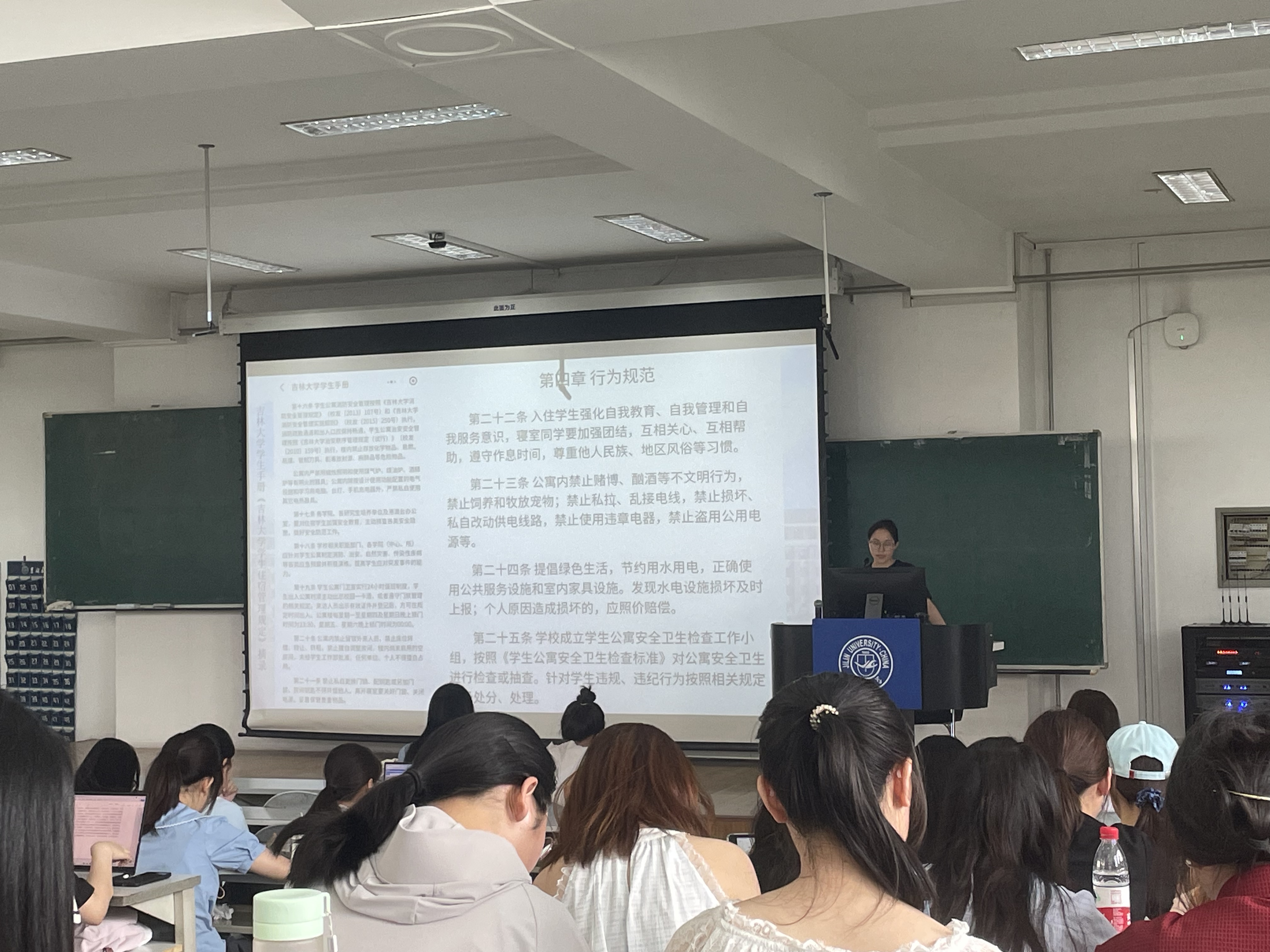 第二个环节,杨老师提醒同学们,此时正值干燥炎热的夏季,大家要树立“安全第一”的理念,做好自身防护,注意宿舍卫生,营造安全卫生的寝室文化。在寝室中规范用电,保管好个人贵重物品。尤其是暑期预计留校的同学,在注重学业的同时也要遵守学校规定,增强安全防范意识,做好个人安全防护。