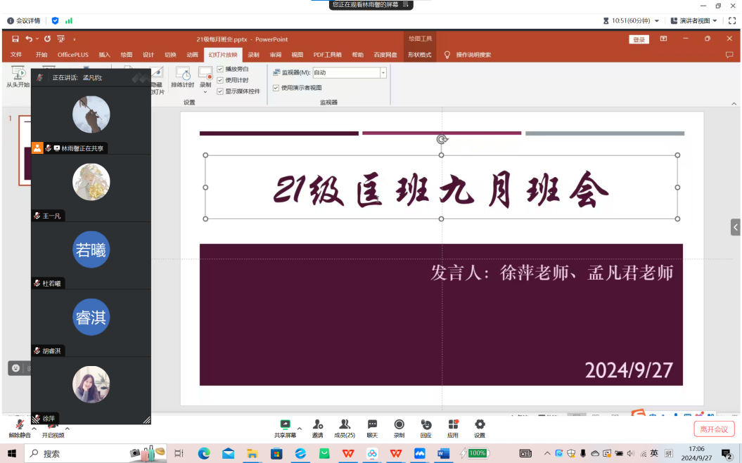 9月27日下午17时,2021级人文科学试验班以腾讯会议的形式线上举行了9月份的班会,班会全程由班长林雨馨主持。孟凡君老师首先就保研这一当前首要的话题发表了见解,鼓励同学们不必过分纠结于眼前的选择,而是用更加长远的眼光来看待自己的学术生涯。针对考研同学,他强调,考研是一场持久战,需要同学们保持高度的专注力。谈及就业问题,他鼓励大家坚定自信,相信自己在大学四年里所积累的知识和能力足以应对职场挑战。此外,孟凡君老师还建议同学们可以选择那些精力充沛、研究成果丰富的青年教师作为指导老师,以获取更多的学术启发和帮助。相信在孟老师的悉心指导和同学们的共同努力下,同学们一定能够迎来更加辉煌的明天!