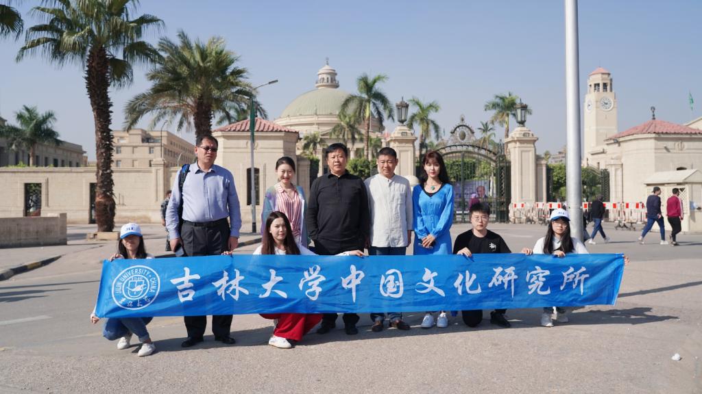 中国文化研究所项目组师生在开罗大学门口合影)