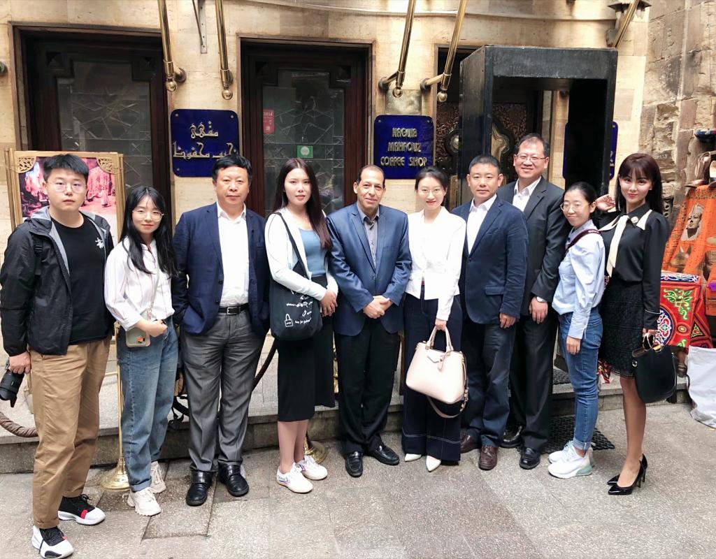 项目团队调研目标不仅包括政府、高校、媒体和产业实体,即政策制定者、语言运用者的基本情况,同时也包括中国商会、留学生团体、驻埃企业和本土媒体等。受埃及中国学生学者联合会主席摆克成的邀请,访埃期间,项目团队成员与中国驻埃及大使馆公使肖军正、文化参赞兼开罗中国文化中心主任石岳文及一秘王贺兰、二秘黑彦海和即将赴任的埃及驻中国大使馆文化参赞欧麦马就埃及的中国语言文化传播相关情况和政策进行深入访谈;对埃及中国商会会长王培中、中资企业协会田丰秘书长、驻埃央企中交一公局陈景华经理、“三·一重工”驻埃经理赵梓纲、民营企业家王虎以及驻埃新华社工作人员进行采访,了解中国语言文化在产业方面的应用;项目团队参加北京市国有文化资产管理中心和开罗中国文化中心联合举办的“感知北京·中埃文化产业交流对接”活动,品味中国传统技艺和埃及传统艺术的交融;上海社会科学院文学研究所和开罗中国文化中心联合推出的“中国文化之旅”系列讲座,权衡教授从经济学角度剖析中埃文化产业交流的广阔前景;实地探访艾因·夏姆斯孔子课堂,深入了解中国语言文化的异域传播。穿行在诺贝尔文学奖获得者马哈福兹笔下的麦格巷、宫间街,参观其闹中取静的故居和日常创作的平民咖啡馆,更深刻感受到其细致入微的创作风格。