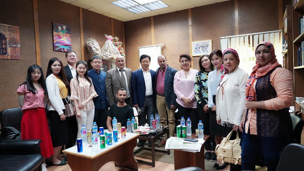 (巜文学消息报》主编塔黑尔博士(右六)、副主编、作家、评论家曼苏拉博士(右五)、爱资哈尔大学中文系主任阿齐兹教授(左六)、青年翻译家、作家、评论家米拉(右四)等学者与项目组师生在文学消息报社合影)