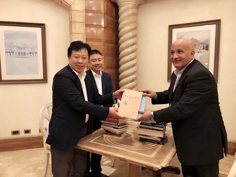 哲学社会科学资深教授、中国文化研究所所长张福贵教授(左一)和爱资哈尔大学中文系主任阿齐兹教授(右一)互赠图书)