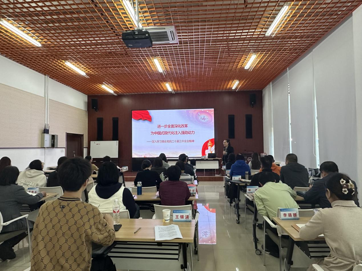 哈尔滨工业大学马克思主义学院黄英教授以“进一步全面深化改革,为中国式现代化注入强劲动力”为主题,为全体培训班学员进行专题授课,深入学习领会党的二十届三中全会精神。黄英教授对全面深化改革的重要意义、全面深化改革推进中国式现代化系统部署、深入领会习近平总书记重要讲话精神等四个方面进行全面系统、深刻翔实的阐述,加深了全体成员对习近平总书记关于全面深化改革的一系列新思想的理解。